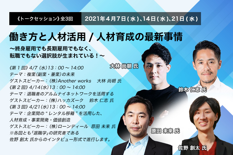 今回は、3回に亙る各回1時間のトークセッションを通じ、働き方と人材活用の最新事情として、企業にとっての、そして個人にとっての新しい選択肢を対談形式で様々な観点からご紹介し、働き方と人材活用の未来を皆様とともに考えてみたいと思います。是非ご参加ください。