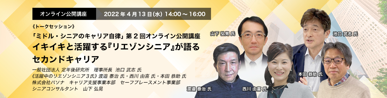 そこで今回の公開講座は、定年後研究所の全面的ご協力も頂きながら、リエゾンシニアのリアルに迫るトークセッションとしました。定年後研究所の池口所長の講演と、3名のリエゾンシニアと池口所長のトークセッションにより、イキイキとしたセカンドキャリアの実現に向けて、当事者であるミドル・シニアの皆様や、それを支える人事・人材開発部門の皆様に、たくさんのメッセージを発信して頂こうと考えています。